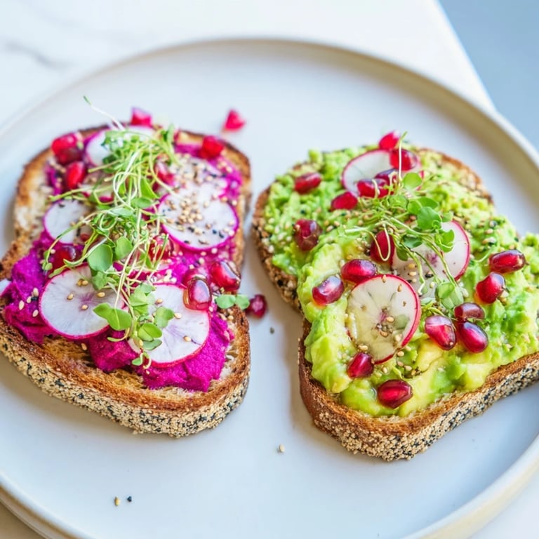 - Top each toast with radish slices, pomegranate seeds, and microgreens.
