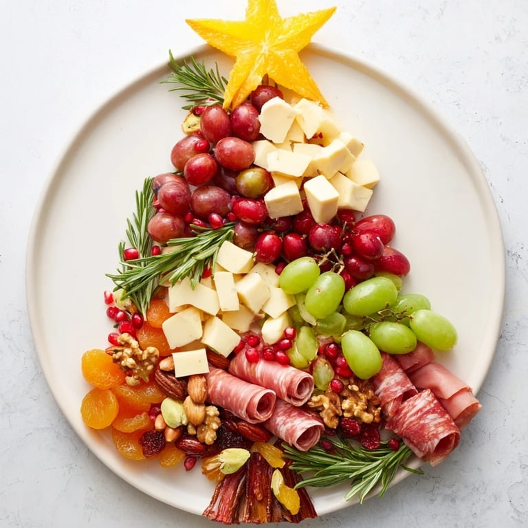 This festive platter creates a visually stunning centerpiece shaped like a holiday tree, combining a colorful mix of cheeses, cured meats, fresh fruits, assorted nuts, and crunchy crackers. The base is outlined with fresh rosemary sprigs while starfruit or a star-shaped cheese crowns the top. Ideal for quick assembly, the platter requires no cooking and can easily accommodate vegetarian options. It's perfect for gatherings, offering a variety of flavors and textures to delight guests and complement seasonal celebrations.