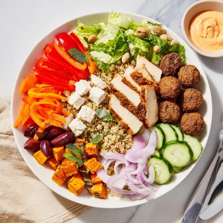- Prepare all protein options according to preference (grill, bake, or sauté chicken, tofu, shrimp, and falafel). Keep warm or at room temperature.