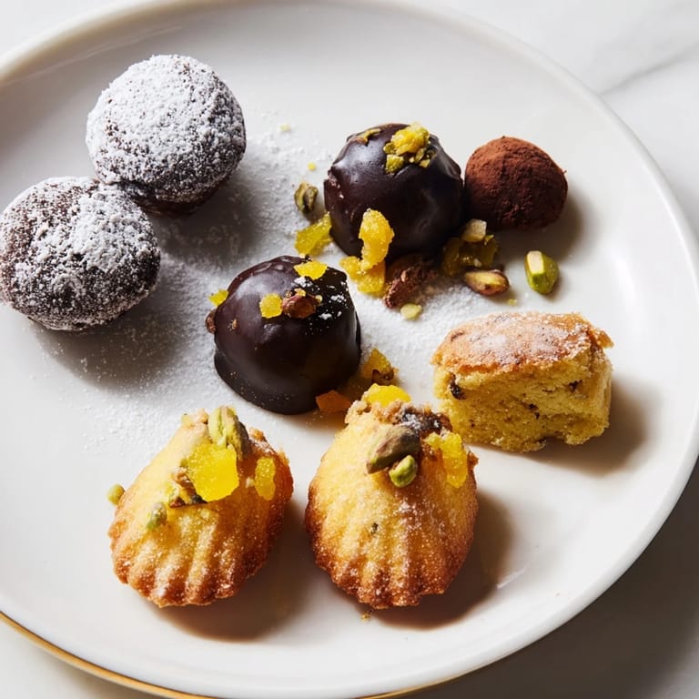 - Arrange financiers madeleines and truffles on a festive platter. Dust with powdered sugar and garnish with candied orange peel or pistachios if desired.