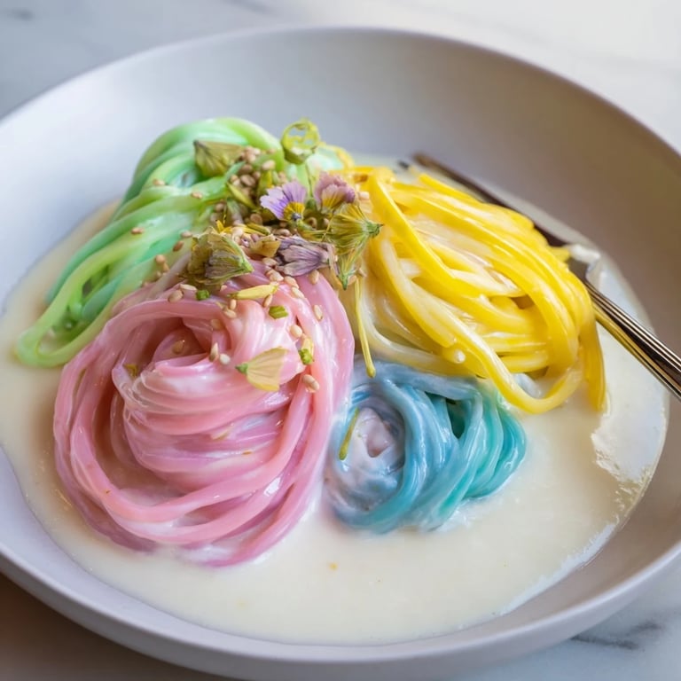 Save A vibrant, whimsical noodle dish featuring colorful noodles nestled in a soft, cloud-like creamy sauce, Neon Noodle Cloud is perfect for parties or to delight kids and adults alike.