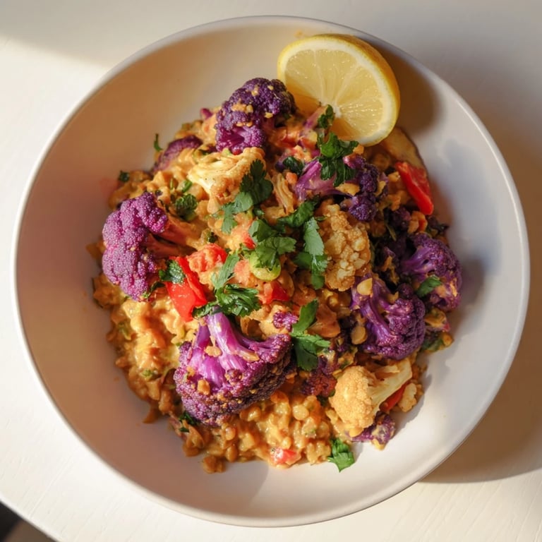 Save A vibrant, nourishing dhal featuring tender cauliflower and red cabbage simmered in a creamy coconut sauce, spiced with warming Indian flavors. Perfect for a cozy vegetarian meal.