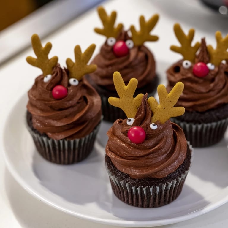 - Assemble cupcakes: Frost each cupcake with chocolate frosting. Insert gingerbread antlers or pretzels, add candy eyes and red nose.