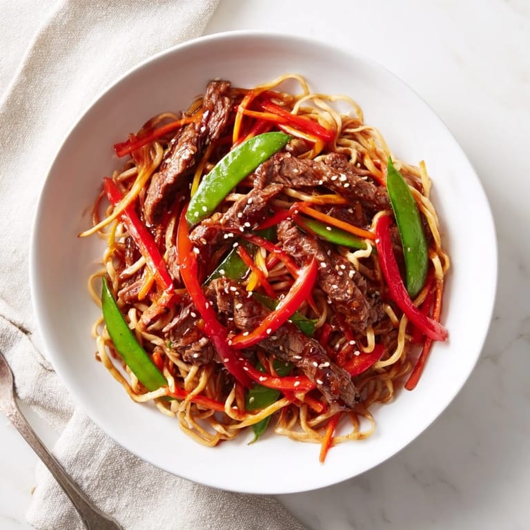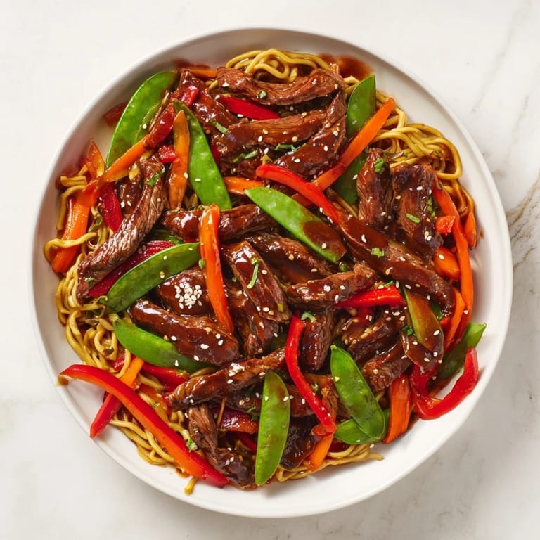 Save Tender strips of beef stir-fried with crisp vegetables and tossed in a savory-sweet teriyaki sauce, served over noodles for a satisfying Asian-inspired meal.
