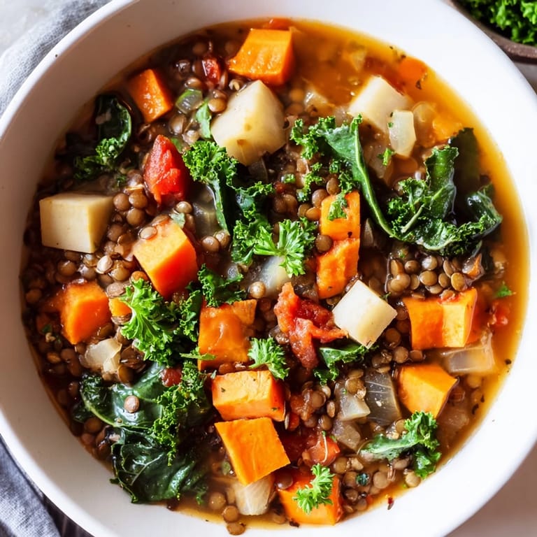 Save A hearty, nourishing soup packed with seasonal winter vegetables and protein-rich lentils, perfect for warming up on cold days.