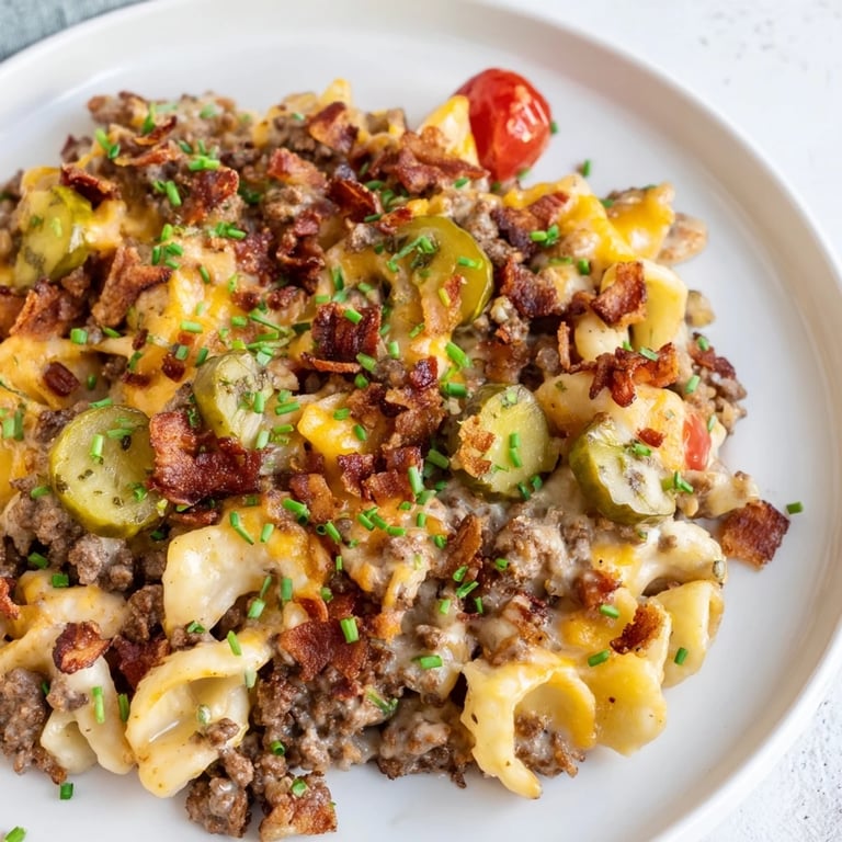 This comforting dish combines tender pasta with crispy bacon, ground beef, and a rich cheese sauce made from cheddar and mozzarella. Aromatic sautéed onions, garlic, and a blend of tangy ketchup, mustard, and Worcestershire sauce add depth to the meaty filling. Pickles bring a subtle crunch and acidity, enhancing the overall balance. Baked until bubbly and golden, this pasta bake is perfect for gatherings and family dinners. Let it rest a few minutes after baking to meld flavors before serving garnished with fresh chives.