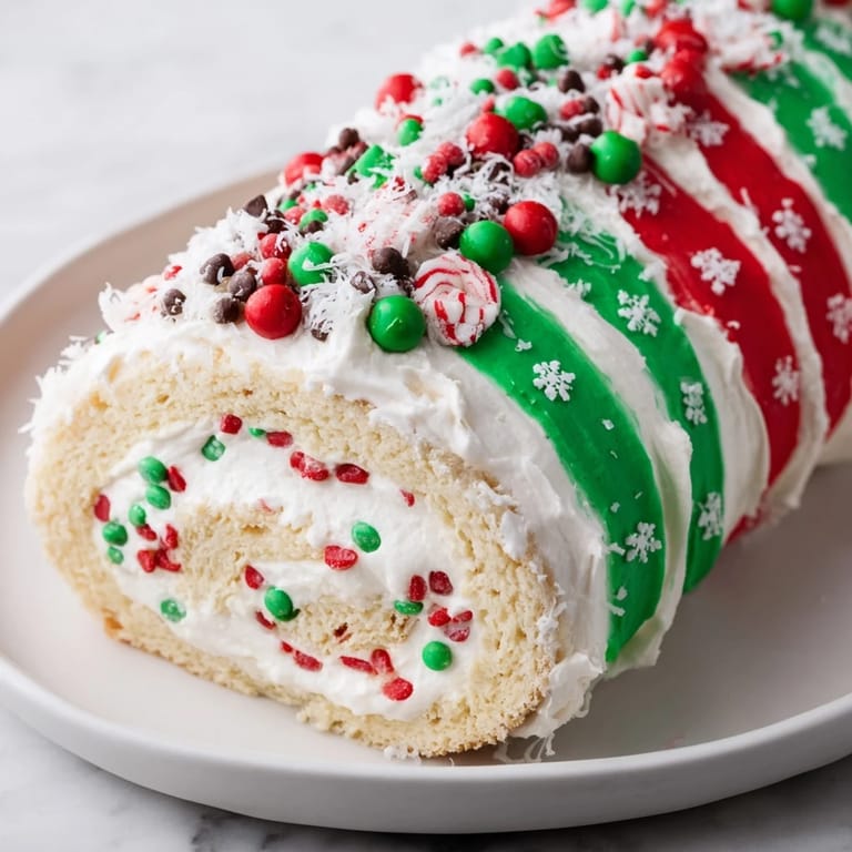 This festive cake roll features a store-bought Swiss roll adorned with vibrant red, green, and white frostings to mimic holiday sweater patterns. Decorated with sprinkles, mini candies, and optional coconut for a snowy touch, it offers a quick, fun, and visually appealing dessert perfect for gatherings. Optional filling adds richness, while chilling helps set the colorful design.