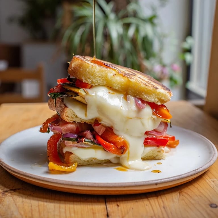 Save A vibrant twist on the classic grilled cheese featuring roasted seasonal vegetables melty mozzarella juicy tomatoes and fresh basil all sandwiched between golden crisp sourdough slices
